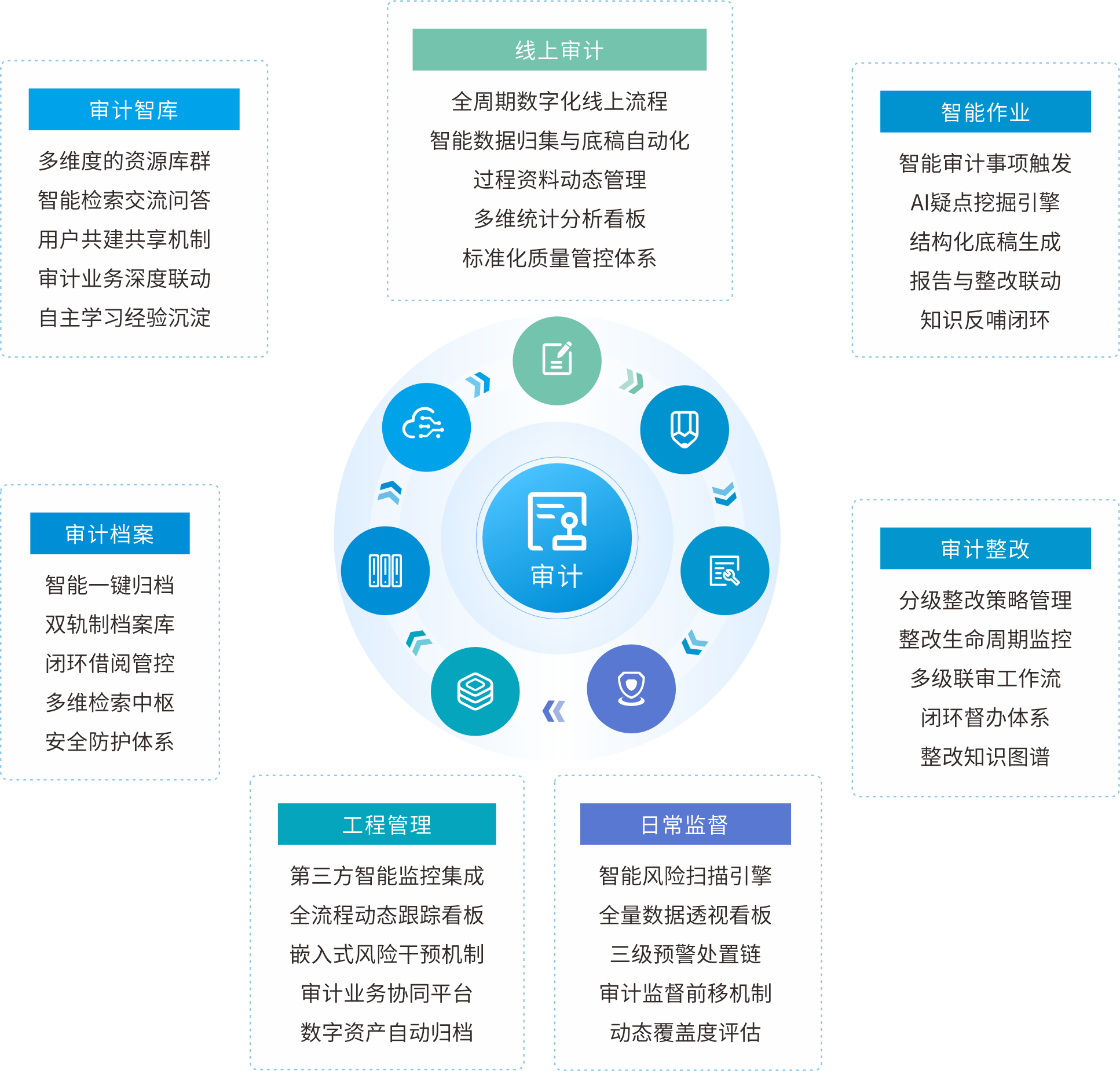 实现财务、专项、内控、信息化等审计业务流程的全面网络化,构建审计人员与被审计对象间业务与数据双向互动的平台,以缩短流程周期,增强审计工作的效率及管理品质。