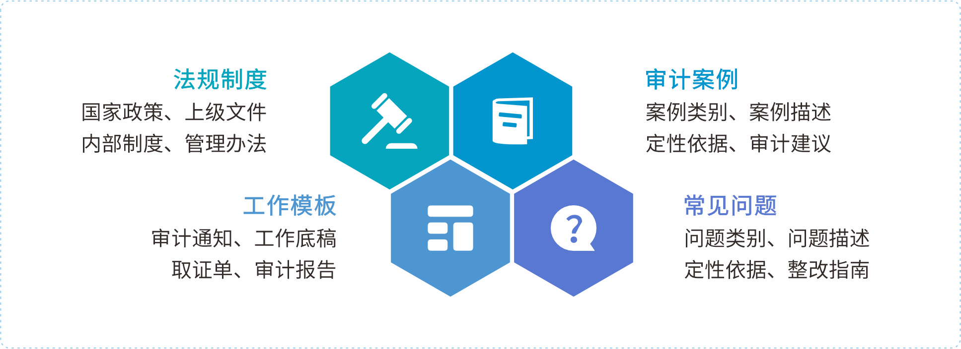包括审计法规库、内部制度库、审计专家库、风险案例库、审计问题库、审计技巧库等审计智库资源,供审计人员查询、引用和经验交流学习。作为现代审计体系的核心知识中枢,智库中的相关资源、材料可用于直接在审计工作底稿、取证单、问题整改中被调取联查。