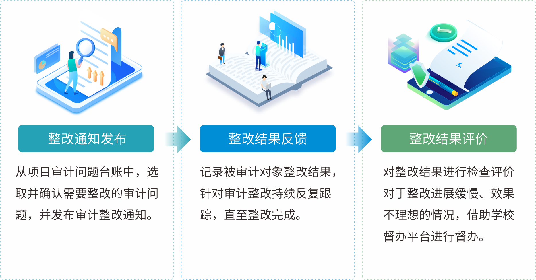 实现即时整改、分阶段整改、持续性整改、审计整改监督以及审计整改复查等多样化的整改需求。针对审计整改事项,进行整改问题的界定、整改成效的反馈以及整改效果的评估等管理活动。针对整改的完成状况,实施流程审批、审计意见的反馈处理、审计意见的复核等流程化管理措施。