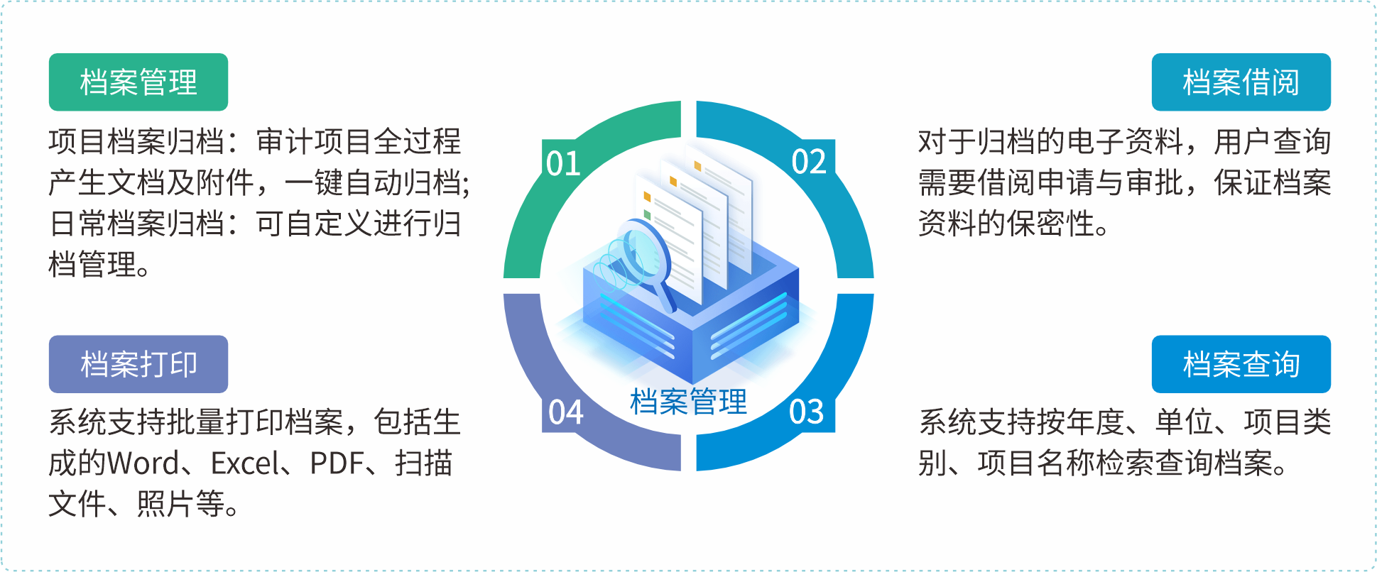 用于项目和部门档案资料的归档管理、借阅查询。项目结束后,工作底稿、审计报告征求意见稿等文档可一键自动归档;审计项目档案和部门日常其他电子文档也能进行归档管理。用户查询归档电子资料时,需先申请借阅,审核通过后才可借阅查询。