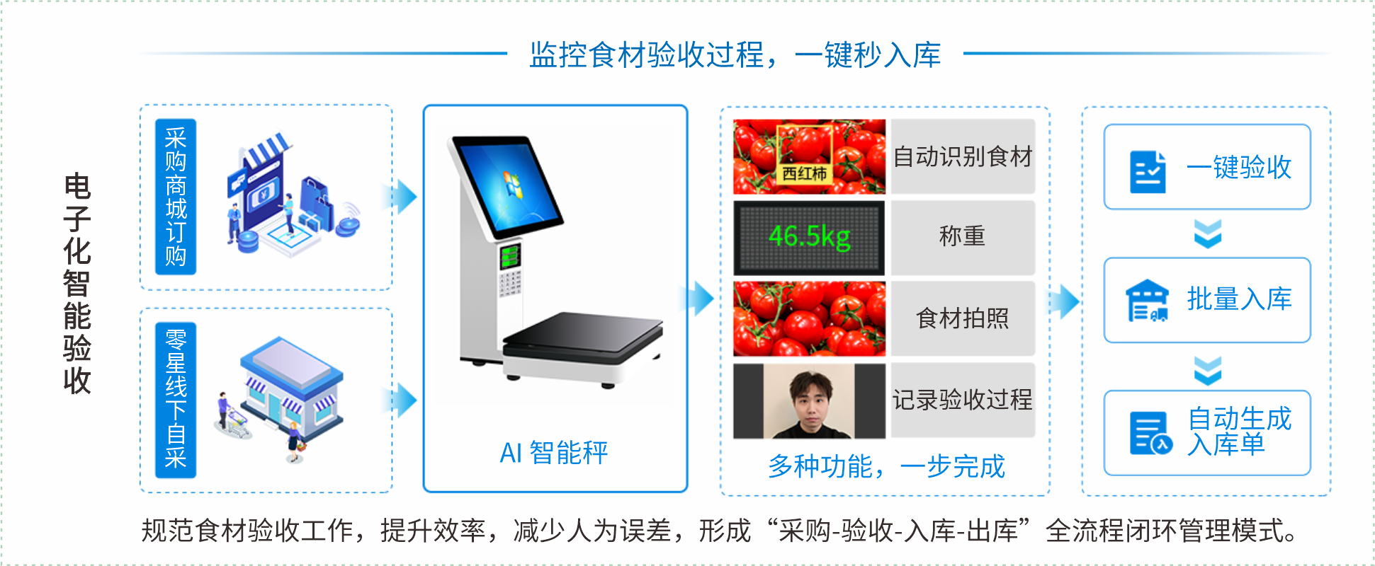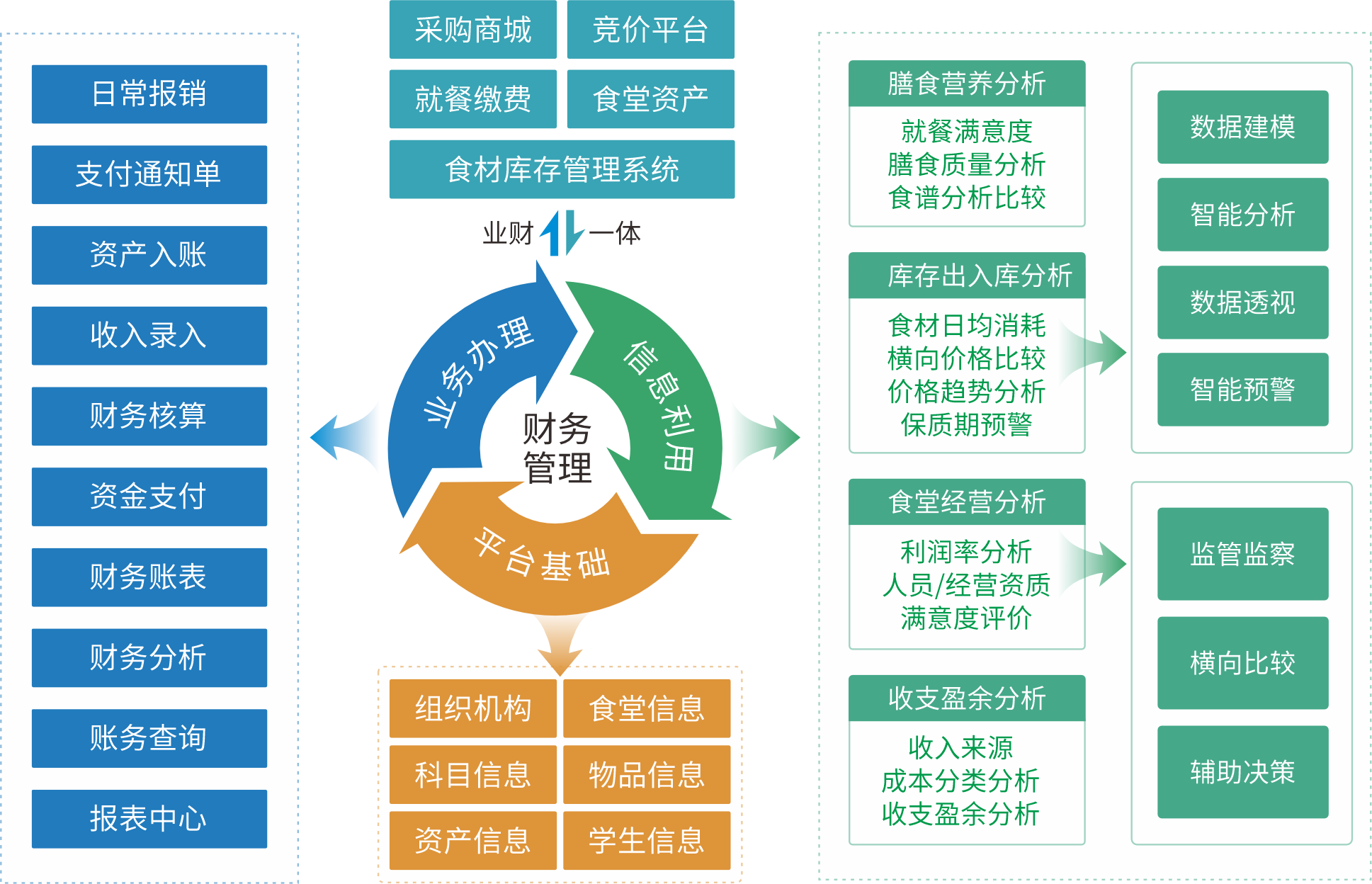 平台实现采购、库存、资产与财务的闭环管理,提供成本、收支、绩效等多维度分析,助力科学决策,改善食堂膳食、安全,规范食堂收支、运营。