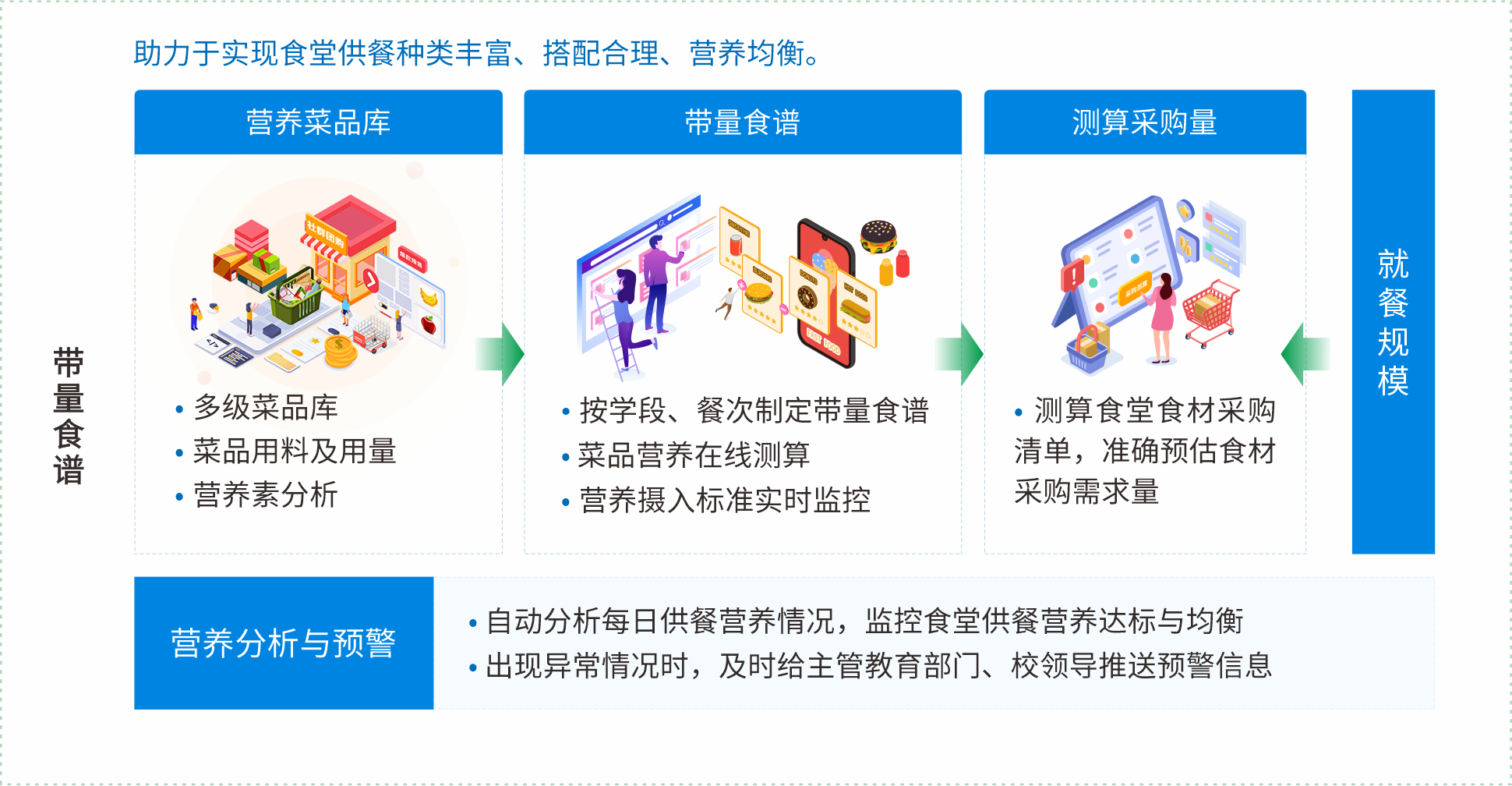 数据建模与预警分析:建立数据分析模型,对学校食堂整体运营情况的各个关键环节的数据进行实时监控,及时预警。