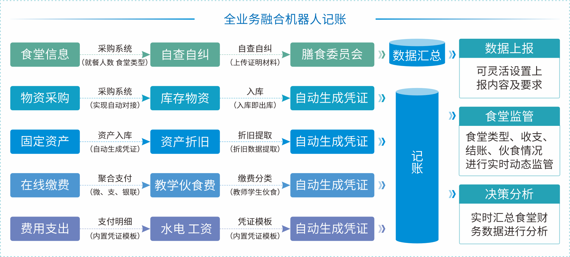 专门基于中小学食堂财务管理制度和业务立项研发,以规范中小学食堂财务管理为目标,将食堂财务纳入学校财务统一管理,单独开展会计核算。按照权责发生制原则,对食堂各项收入支出进行明细核算,为保证食堂收支平衡、严格控制成本开支范围、合理确定供餐价格、维护师生合法权益提供数据支持和监督依据。