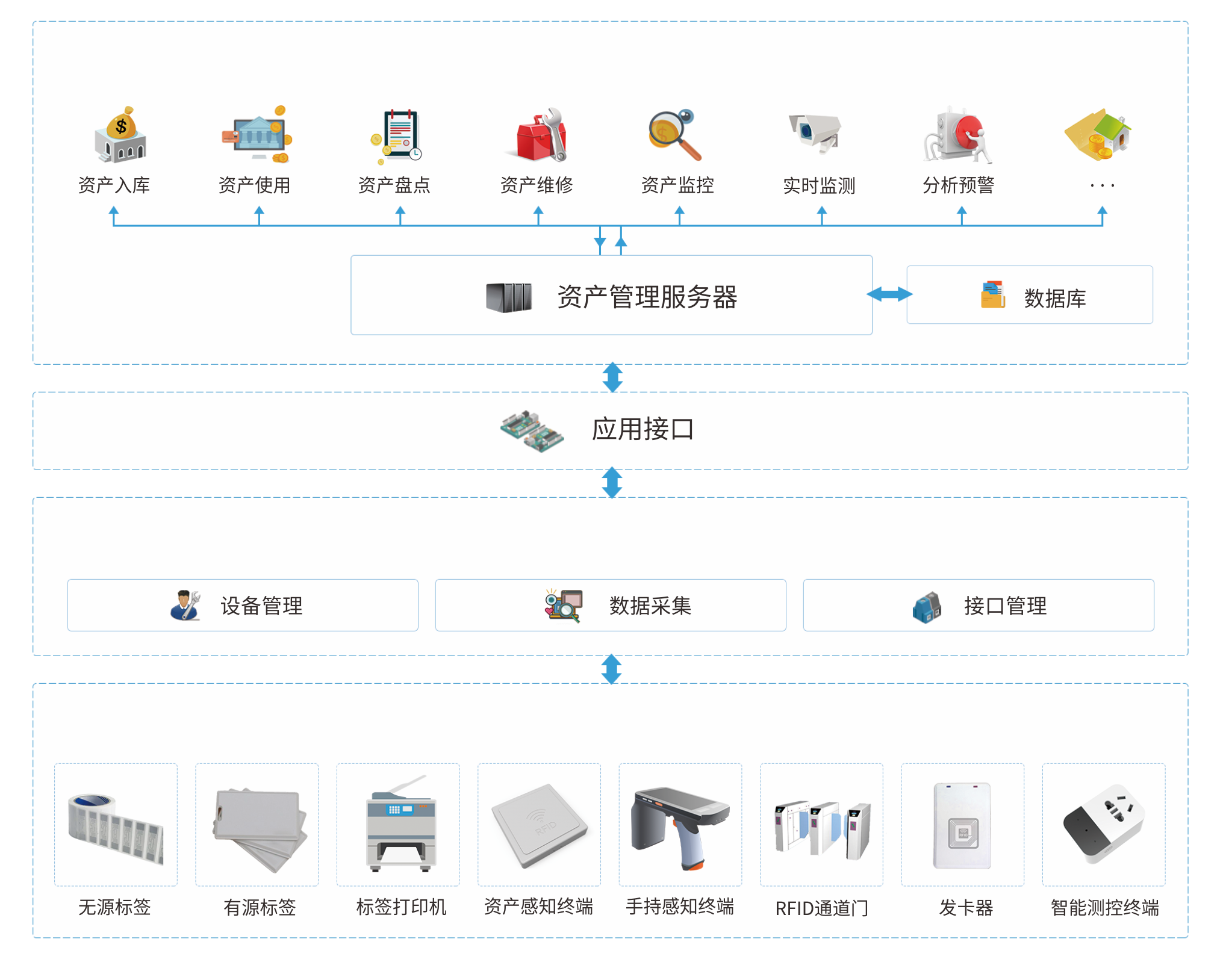 为了进一步提升物联网技术对资产管理的支撑和促进作用,充分利用RFID、传感、遥控、计量、嵌入开发等物联网技术,自主设计并研发智能测控终端、资产感知终端、大型仪器设备共享共用控制器和资产自助服务机等一系列资产管理专用物联网终端和设备。借助物联网技术具有的识别、定位、跟踪、监控与管理的特性,通过赋予资产主动性,创新资产管理手段,变资产管理被动为主动,解决资产管理过程的资产动态监管难、盘点难、安全管理难、绩效考核难、共享共用难等问题。