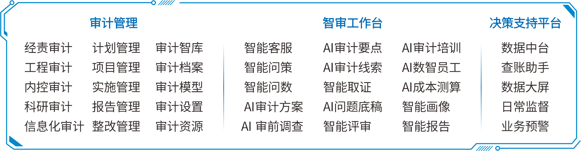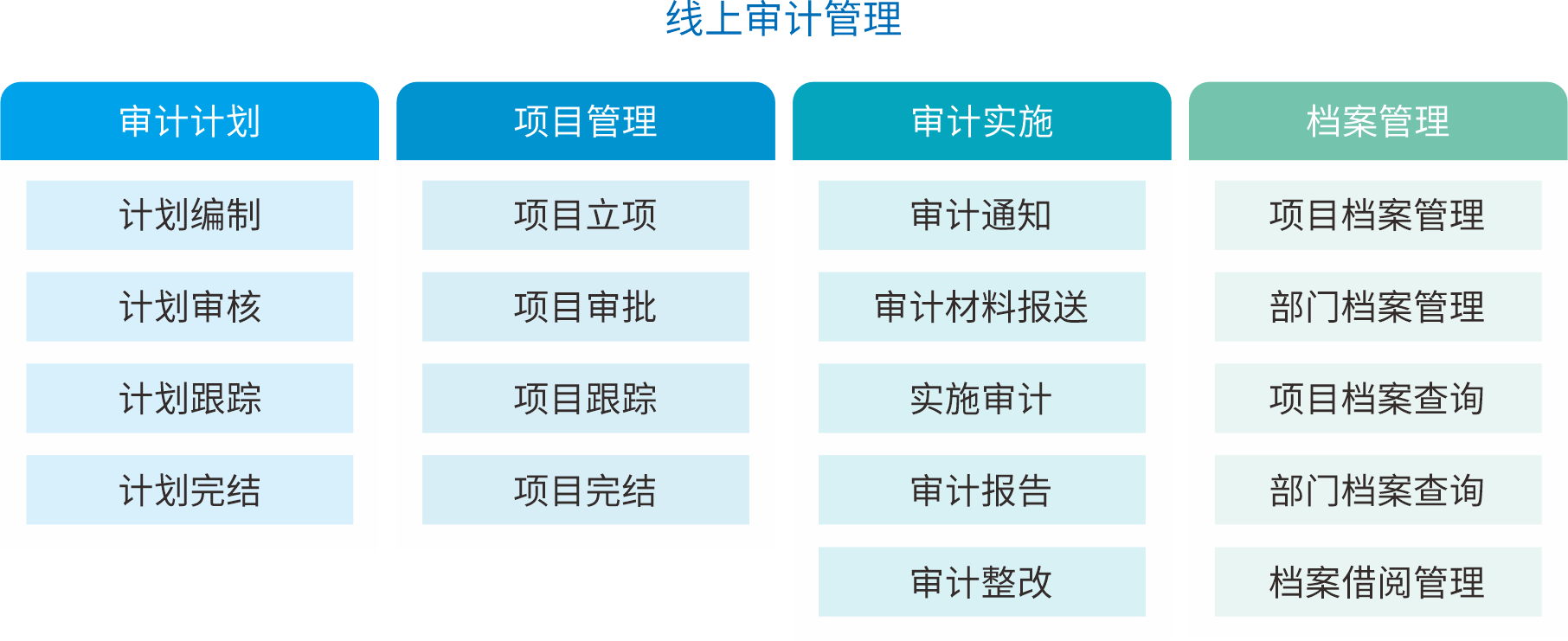 实现财务、专项、内控、信息化等审计业务流程的全面网络化,构建审计人员与被审计对象间业务与数据双向互动的平台,以缩短流程周期,增强审计工作的效率及管理品质。