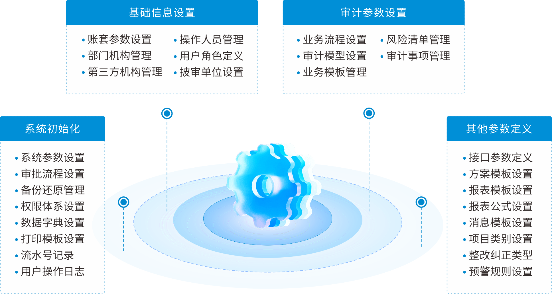 审计设置管理是整个审计系统的全局设置中心,功能和模板定制中心。提供系统级初始化、审计标准定义、模块初始设置、账套参数设置、单位结构设置、部门信息管理、操作人员管理、用户角色定义、被审单位设置,以及审计业务相关的工作流程、附件、人员、模型、问题清单等管理。