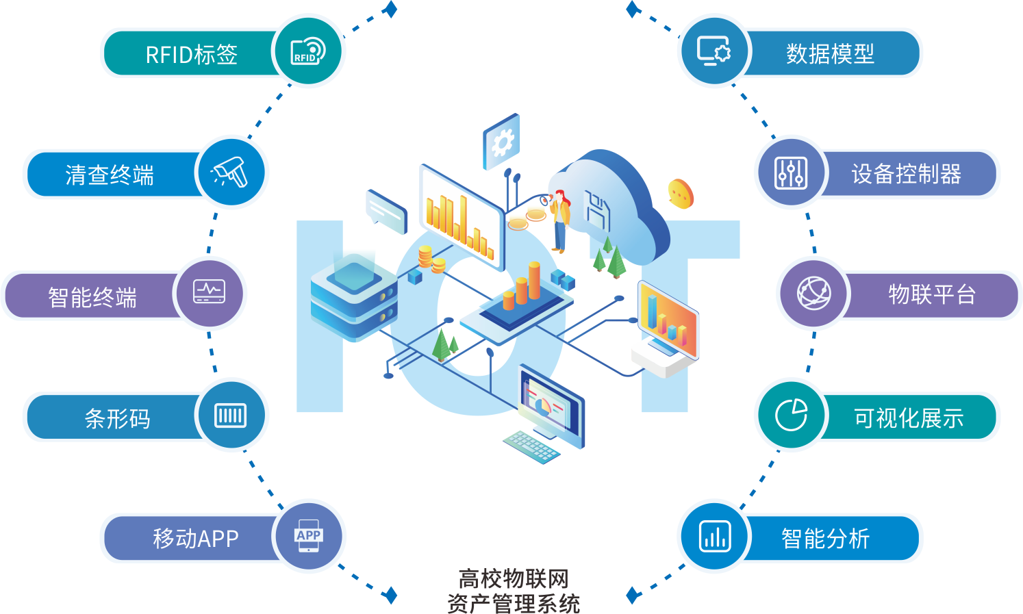 高校物联网资产管理,以“物联网 (IOT)+资产管理”为理念,深度融合物联网技术,借助物联网专用终端与设备具有的识别、定位、跟踪、计量、监测、控制等功能,赋予资产生命力和主动性,实现资产“万物互联、实时在线”,解决资产管理过程的实时掌握难、资产盘点难、动态监管难、绩效考核难、共享共用难等痛点,实现资产能耗管理、助力达成双碳目标,提升资产管理效率和质量的同时,带动整个高校资产管理水平的提高。
