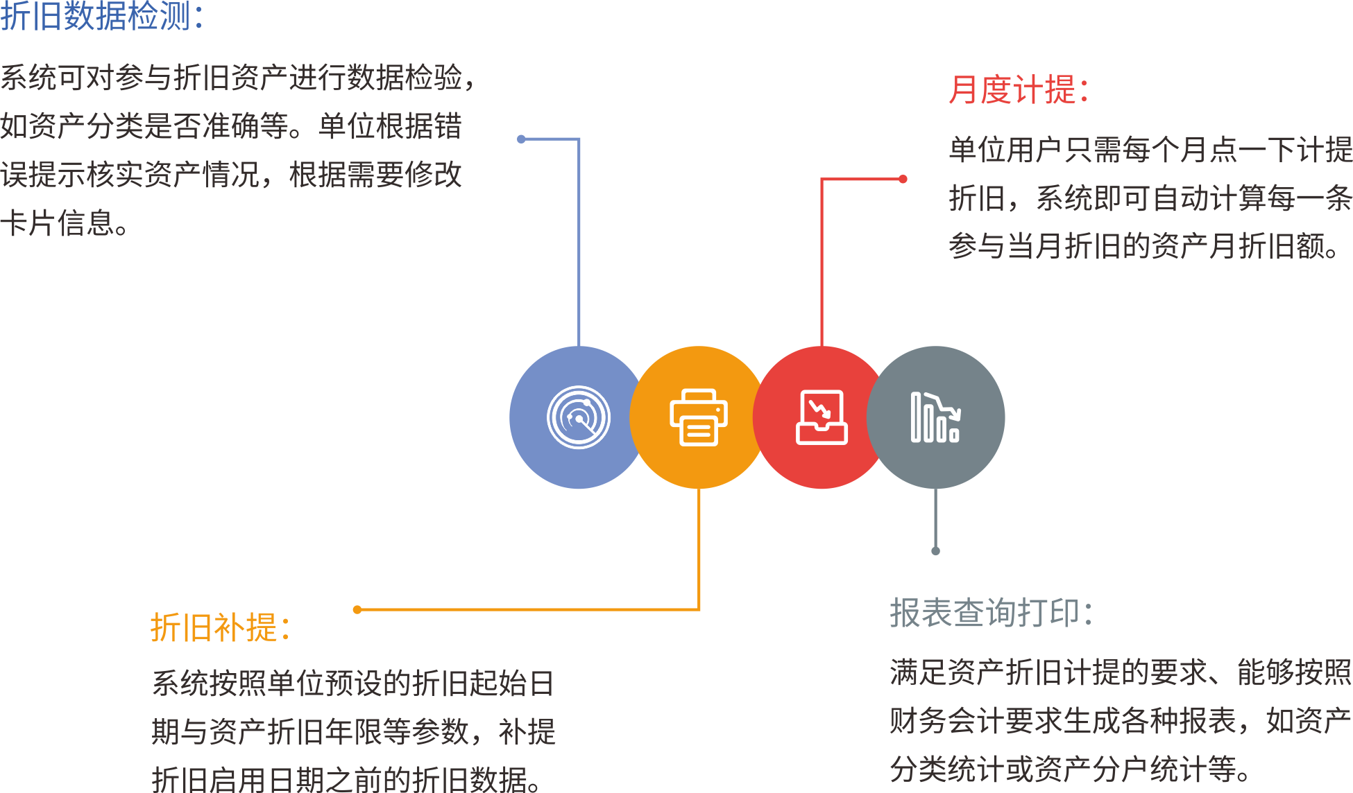 系统可以根据单位预设的折旧年限等参数,自动计算月折旧额,生成财务人员记账所需的各类账表数据,格式与财务会计报表一致,单位可直接导出或打印线下提交。系统支持折旧补提与冲减,支持折旧信息的灵活调整。