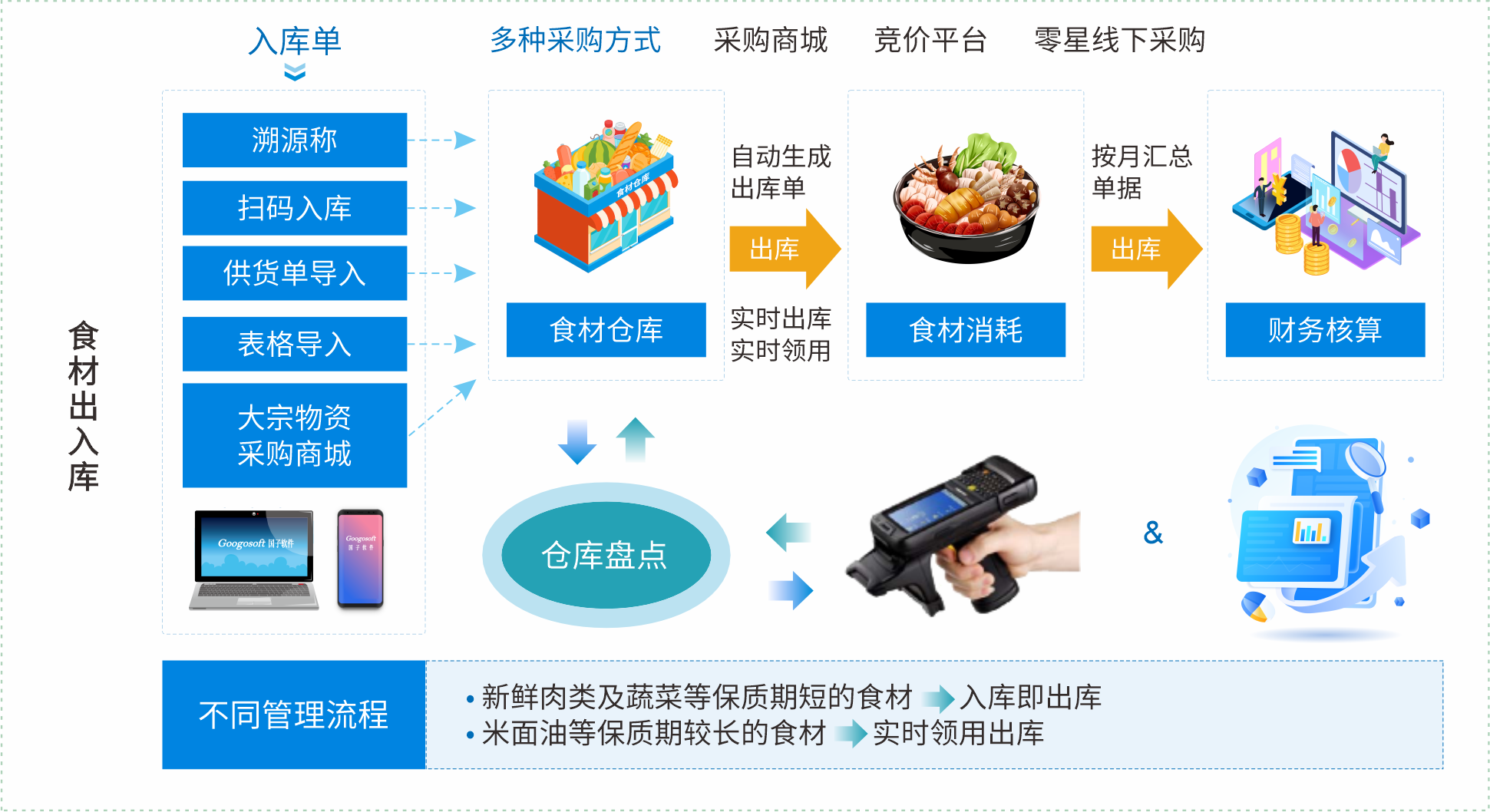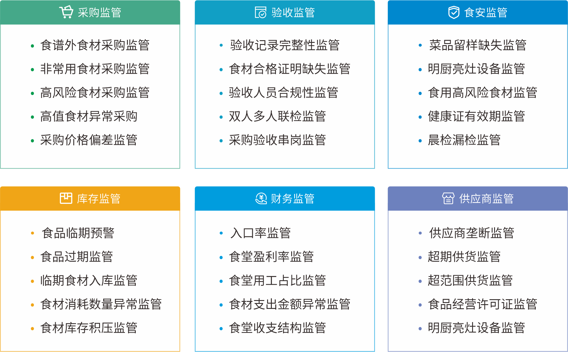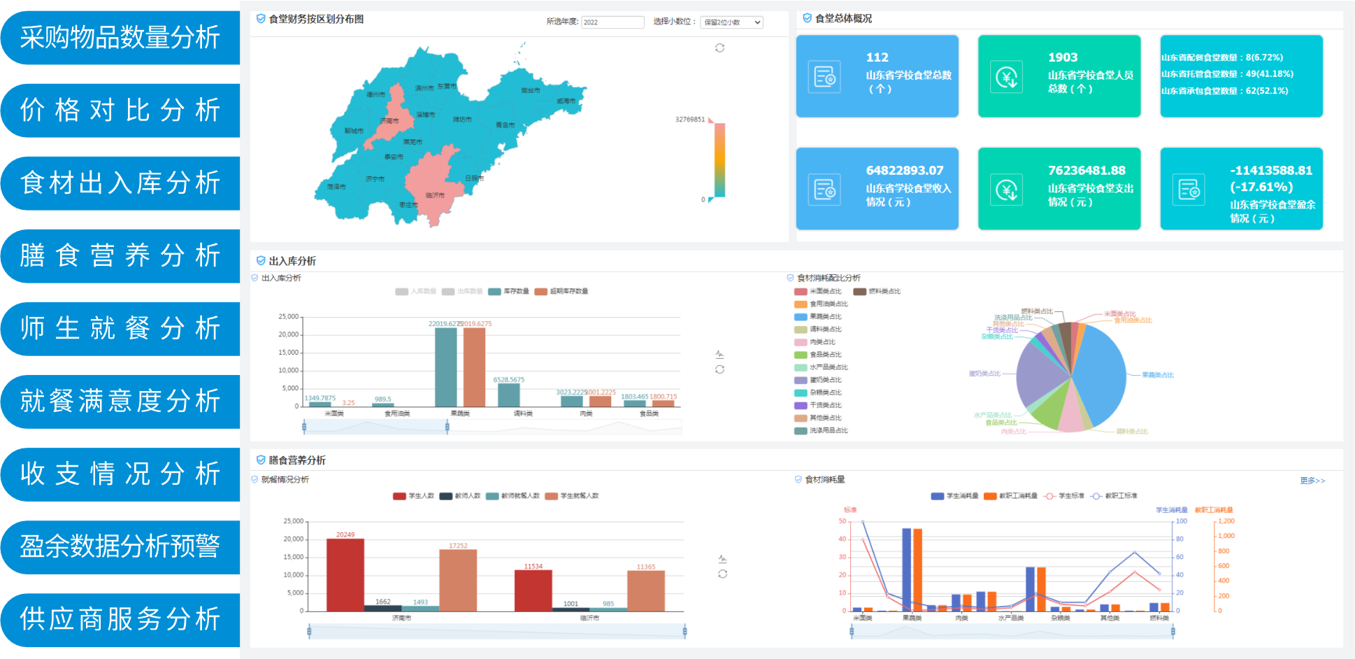 平台实现采购、库存、资产与财务的闭环管理,提供成本、收支、绩效等多维度分析,助力科学决策,改善食堂膳食、安全,规范食堂收支、运营。