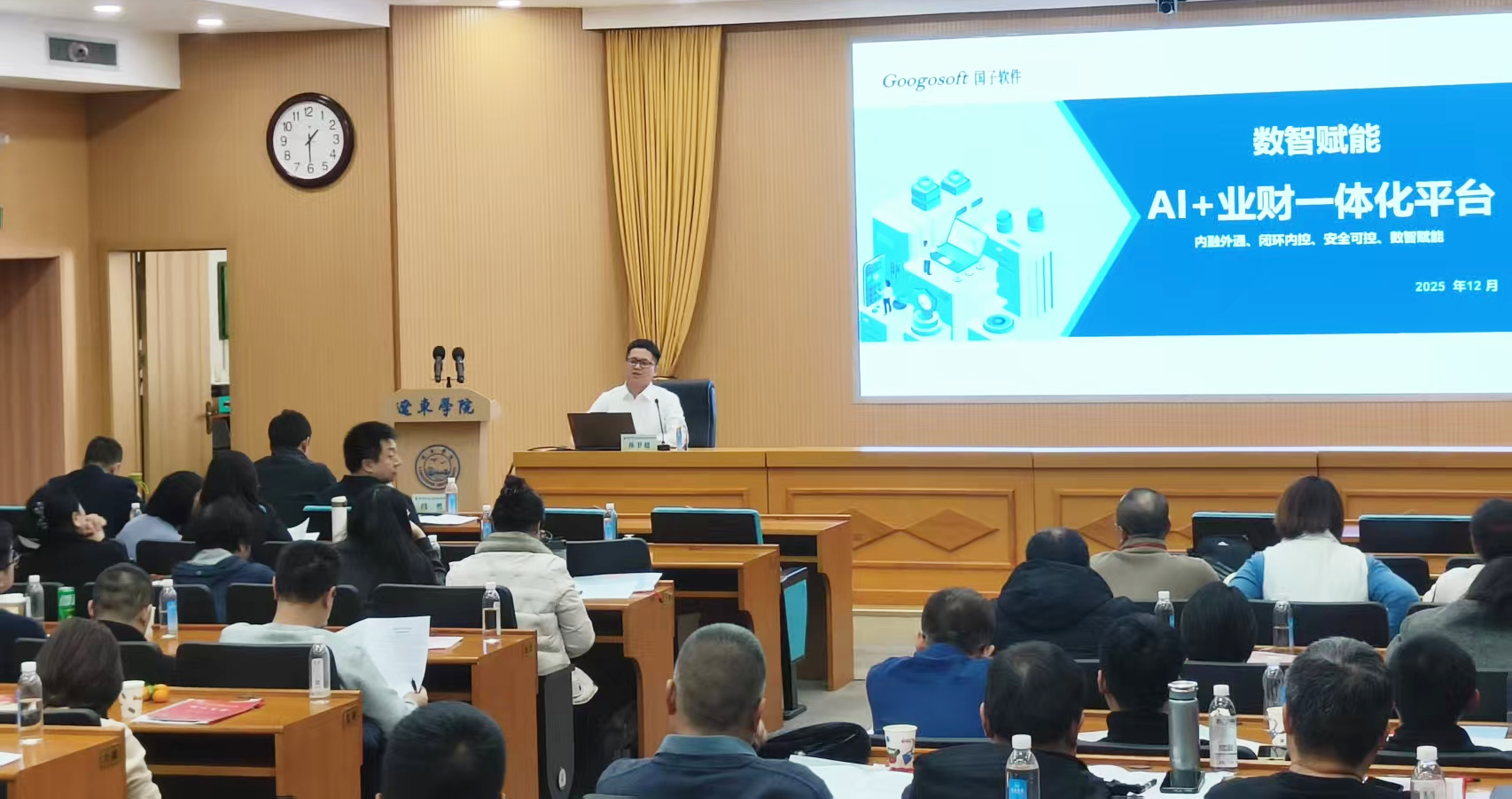 在专题授课与案例分享环节,国子软件产品总监孙卫超以《数智赋能:AI+业财一体化平台》为题,围绕 “内融外通、闭环内控、安全可控、数智赋能” 四大核心理念,系统解读了国子软件 AI+业财一体化平台的建设逻辑与实践价值。