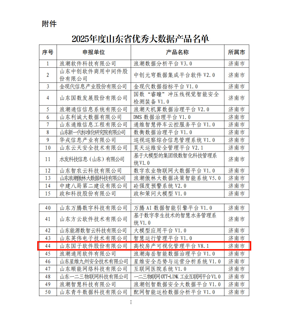 近日,山东省工业和信息化厅正式公示了2025年度省级大数据产业"三优两重"项目名单。山东国子软件股份有限公司自主研发的"高校房产可视化管理平台V8.1"成功入选"山东省优秀大数据产品"名单。