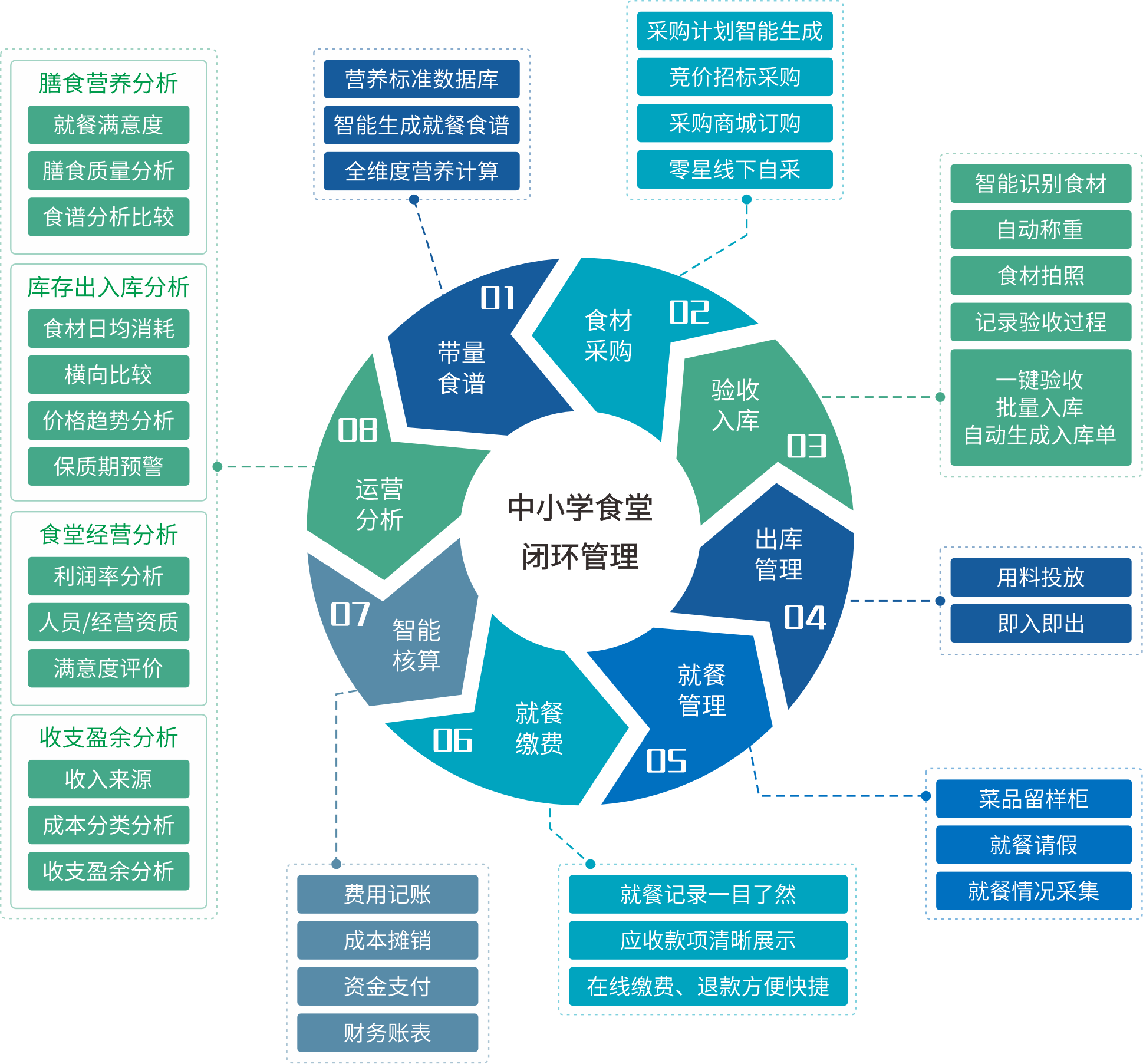 国子云食堂智慧管理平台深度融合物联网、AI识别与大数据分析技术,构建起“采购、验收、库存、就餐、财务核算”+“数智监管”的全链条数字化管理体系。平台支持供应商在线协同与智能比价,确保采购流程透明且可追溯;通过智能库存预警与动态盘点,有效降低食材损耗和存储风险;结合财务自动化核算与可视化报表,显著提升账务处理的效率与准确性;并依托智能终端与移动应用,实现学生在线缴费、请假、退费等业务的便捷办理与实时同步,形成业务流、数据流、资金流“三流合一”的闭环管理生态,全面赋能校园食堂的精细化、智能化运营。