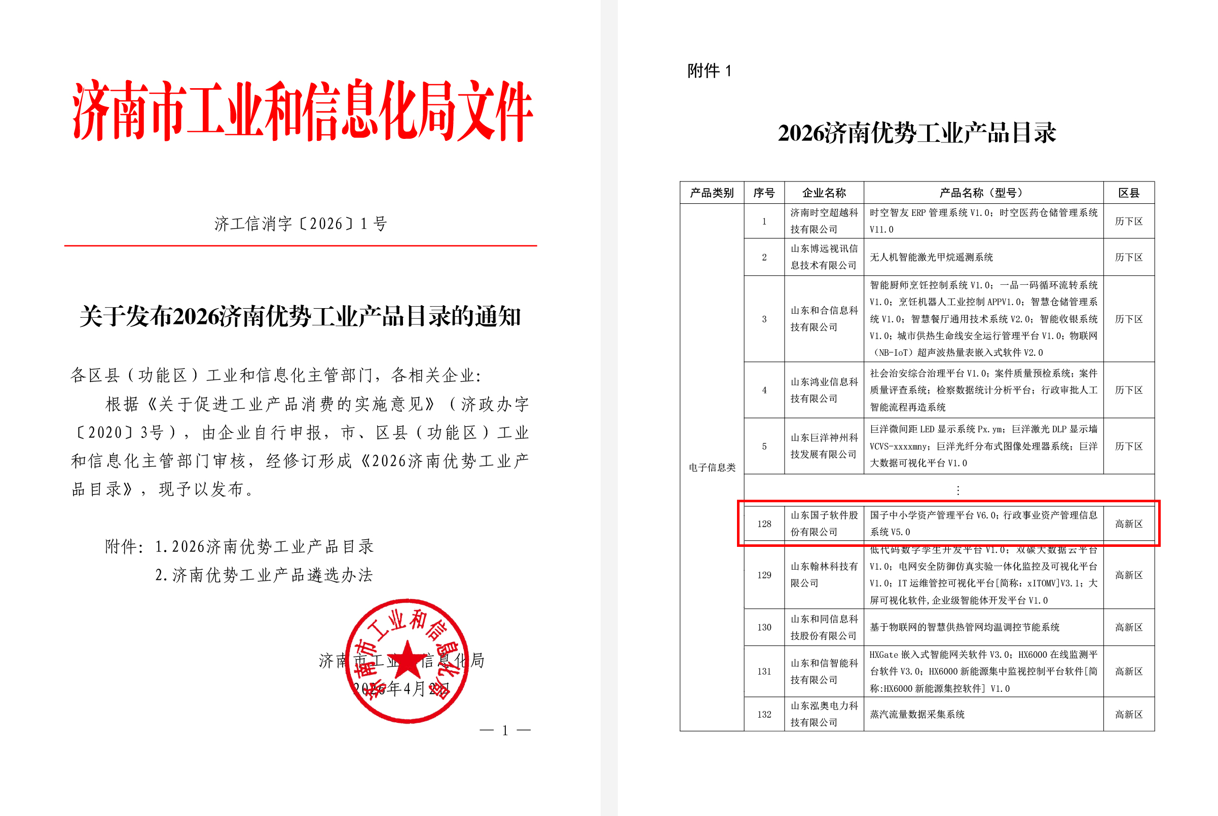 近日,济南市工业和信息化局正式发布《2026济南优势工业产品目录》。国子软件自主研发的“国子中小学资产管理平台V6.0”与“行政事业资产管理信息系统V5.0”凭借卓越的技术创新能力、深厚的行业积淀及突出的市场表现,双双入选该目录电子信息类产品。