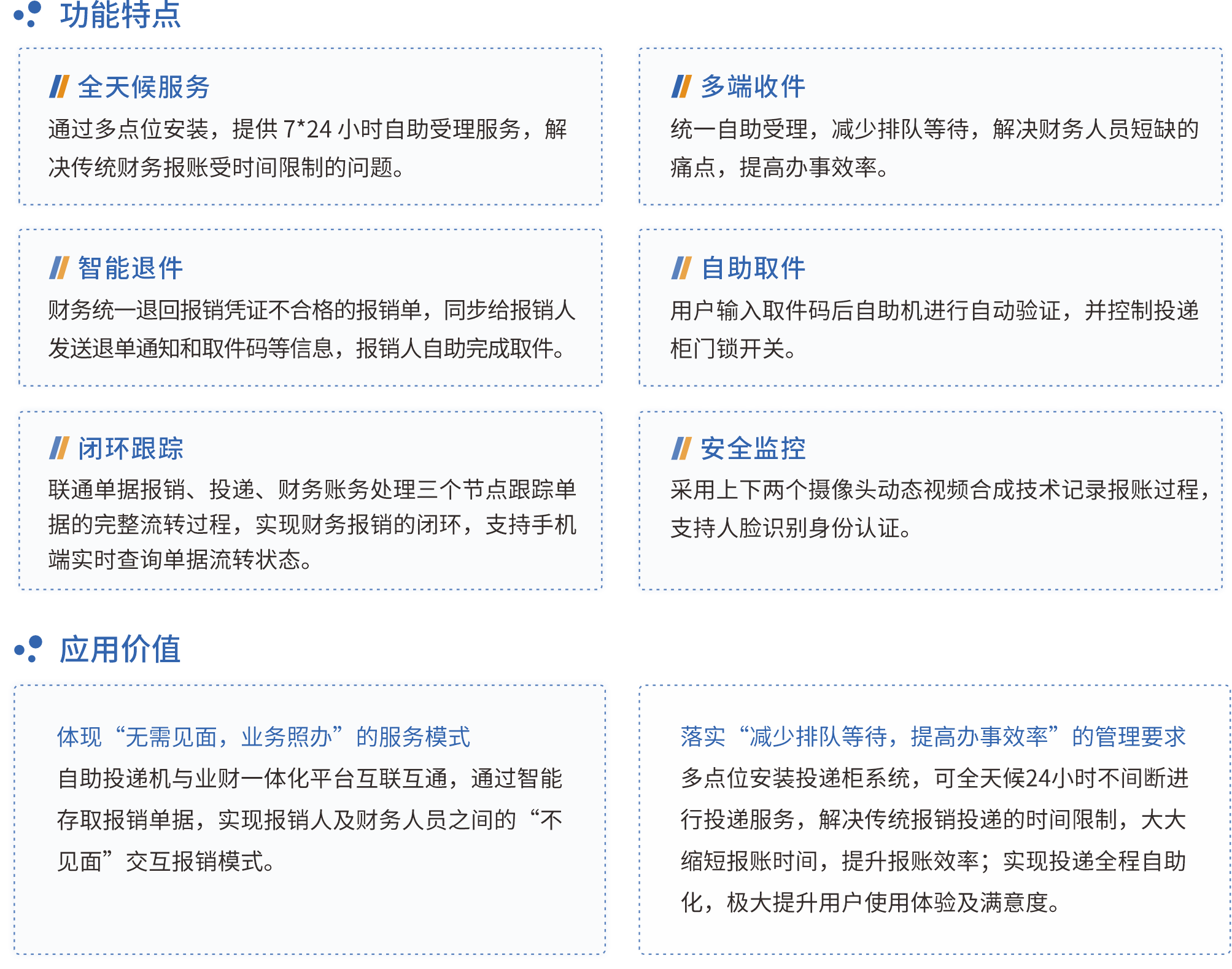 自助投递机是一套基于财务报销凭证自助受理的软硬件融合的智能系统,通过自助投递机的使用可以节省人工成本,规范报销行为,形成智能化、可追溯、全天候的财务报销体系。作为一款便捷易操作的自助投递终端,集成网上报销系统,自动完成信息采集验证,确保原始凭证安全投递,不但实现了不见面服务,同时也减少了纠纷,提高了报销的用户体验。
